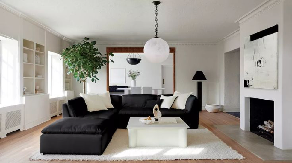 "Hãy chọn một màu chủ đạo và sử dụng màu còn lại làm màu nhấn. Hãy nhắm đến tỷ lệ 70/30, chẳng hạn như một bộ sofa lớn màu đen trên nền trắng của sàn, tường và bàn cà phê. Sau đó, hãy thêm vài chi tiết bằng kim loại", cô nói.